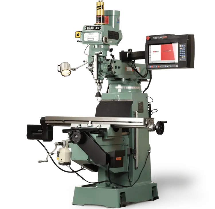 The K3 KMX-3 uses a quill drive for 3-axis machining. Manual quill control is accomplished with electronic handwheels. For most 3-axis machining applications however, we highly recommend our TRAK Bed Mills.