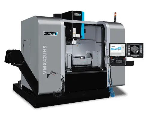 The efficient design of the Hurco 5-axis trunnion table machining centers is a key benefit to consider—we use an integrated trunnion table at Hurco instead of simply sticking a trunnion table on a 3-axis machining center and passing it off as a 5-axis machine. The integrated trunnion table design provides more clearance in Z compared to other brands.