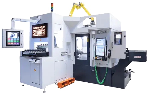 In several SPINNER machines a Robot can be integrated inside the machine or on top of the machine directly. Those are flexible but performing solutions with shorter cycle time as the operator door doesn't need to be opened for loading and the operator is not limited by the robot. The process is quick and can be watched through normal front door.