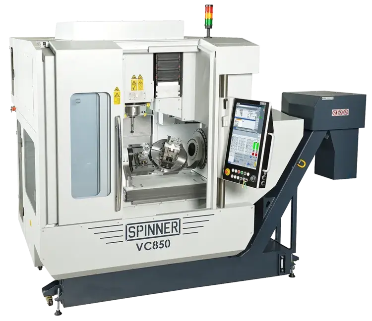 The VC850-5A is a 5-axis Vertical Machining Center for high performance 3+2 and 5-axis simultaneous machining with spindle speeds up to 18,000 rpm. This machine has an integrated rotary-/swivel table that is perfect for workpieces up to about 350mm on rotary table and accommodates parts of many different sizes and materials. It is available with the most modern controls such as Heidenhain and Siemens.