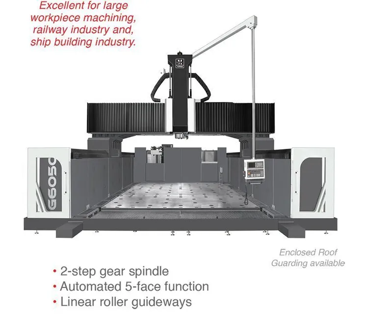Gantry type bridge machine with a big work envelope for machining large parts. X travel length is up to 1417″ (36M). And the Y travel is up to 196- (SM) wide. Transmission system uses rack and pinion linear motion with a German gear reducer. Twin servo motors are synchronized to eliminate backlash for optimal precision.
