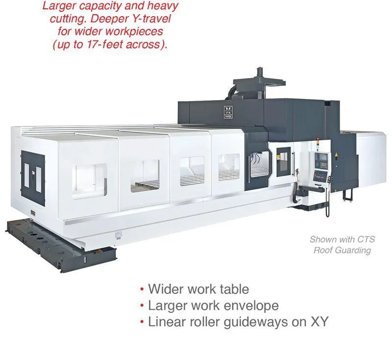 Bridge mill features a larger Y-axis for an expanded work table surface. Heavy-duty linear guideways on XY axes and box ways on Z-axis. Flexible machining with manual milling heads: 30° angular, 90° angular, universal, and extension.