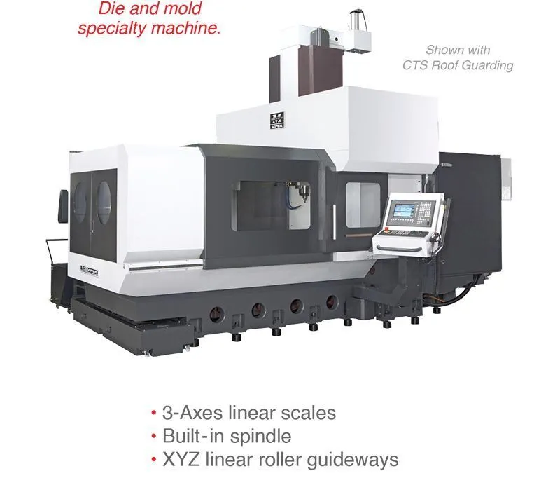 Specially designed bridge mill-engineered for die and mold machining. Built-in spindle reduces effects of vibration and thermal displacement. Linear scales on 3 axes utilize a closed-loop system that aid in high-precision positioning and contour machining. Excellent for machining of automotive molds.