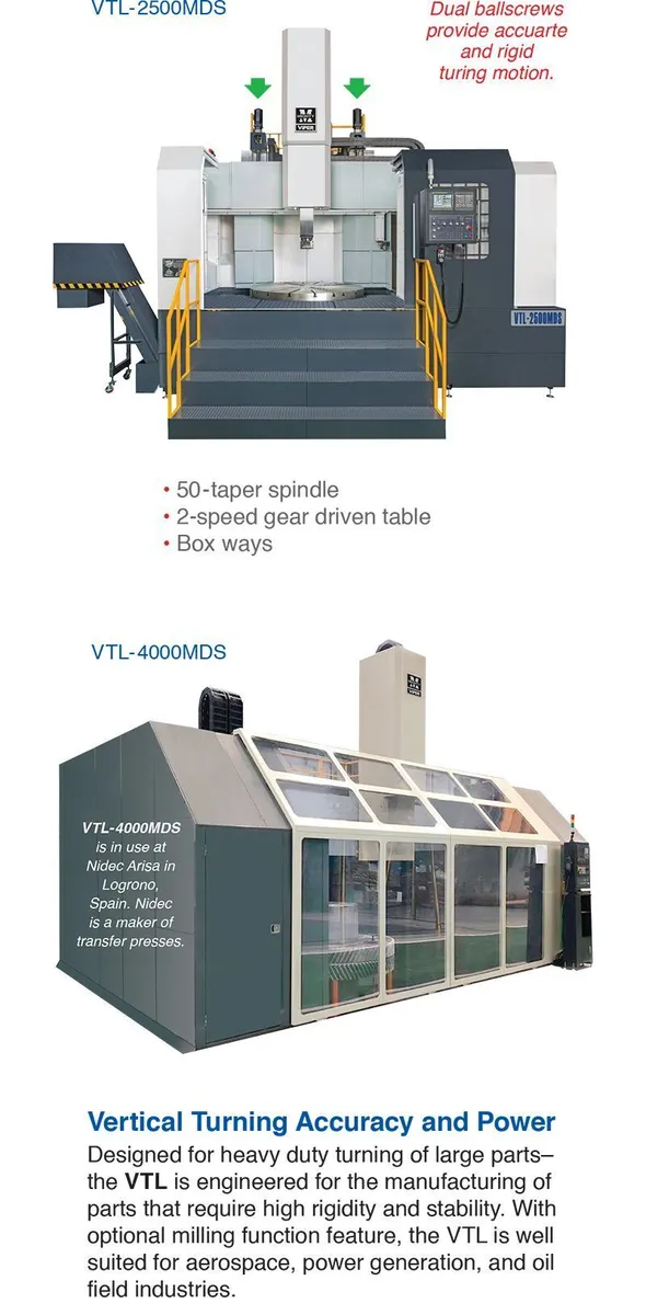 Designed for large parts vertical turning with an optional milling function. Features a W-axis with dual columns, and dual ballscrews. And two spindle motors to power the work table.
