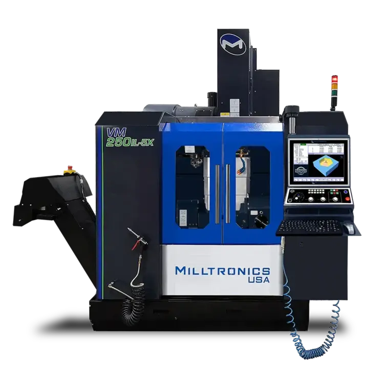 The VM250IL-5X is the largest of Milltronics’ 5-axis machining centers with X, Y, Z travels of 30 x 20 x 20.5 inches. Its rotary table offers +30°/-110° of A-axis rotation and 360° in the C-axis. This vertical, linear way machining center features a 12,000-RPM, BIG–PLUS® ISO No. 40 spindle and a 40-tool ATC. An added benefit is its user-friendly INSPIRE+ control, which provides improved surface finish and cycle times, an advanced proprietary motion engine, and a 19-inch, color, LCD touch screen.